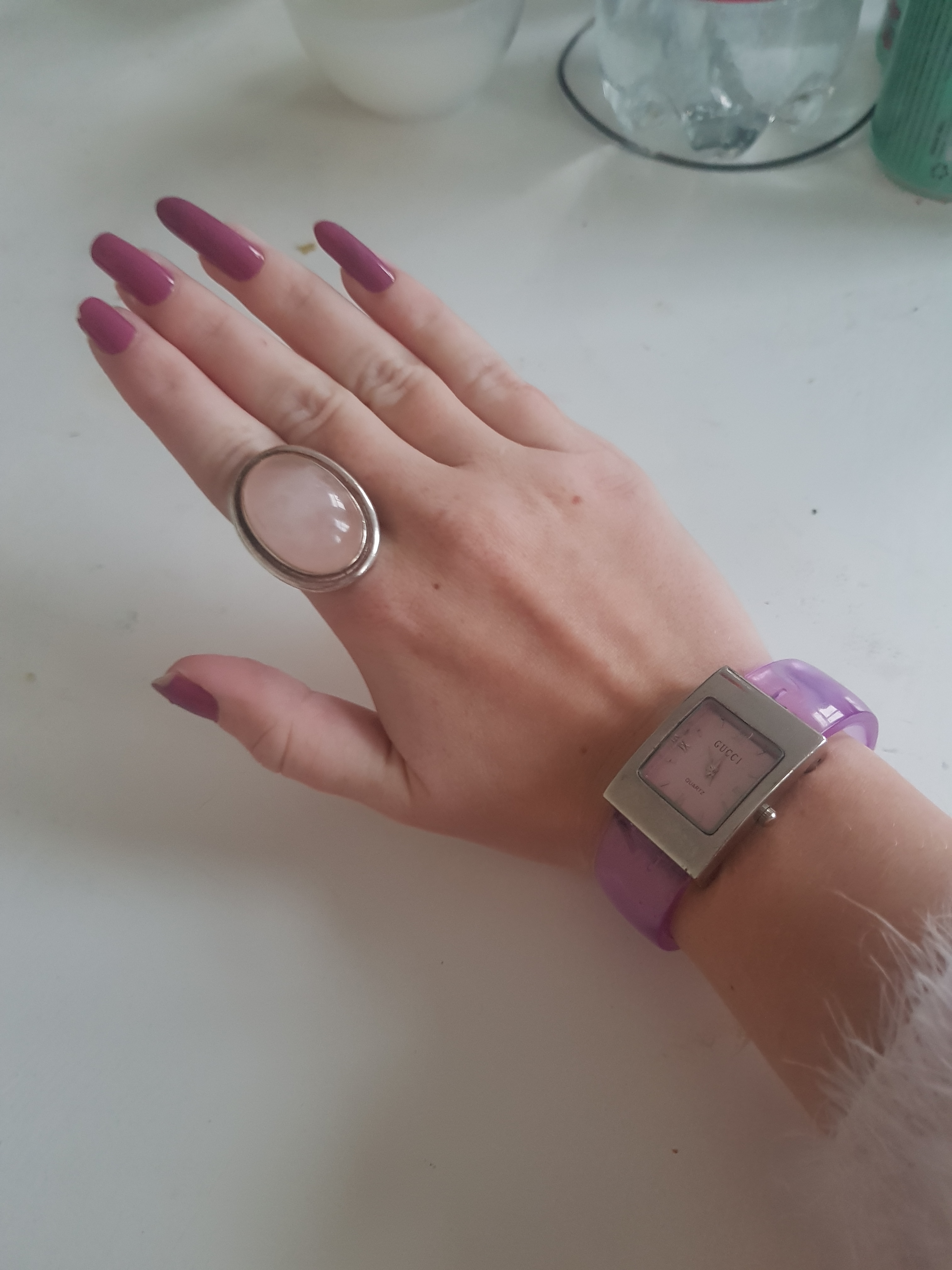 Laat ik eens met de deur in huis vallen over mijn tweedehands vondsten. Ik heb fashionable pieces gescoord en ik zal er een paar laten zien. In de afbeelding is mijn favoriete ring te zien. Ik heb hem gescoord op de Vinted app. Hij was maar €6,50. Het is echt 925 zilver en de steen is een echte rozenkwarts. De horloge is een vintage Gucci. Ik heb hem gevonden op een kringloopwinkel en hij kostte maar €4,- Nou zijn dit niet zomaar vondsten die je meteen doet, als je een kringloopwinkel binnenwandelt, maar er zijn toch wel mooie stukken bij. Ik zeg maar altijd, als je lang genoeg zoekt, dan vind je altijd iets moois. Je moet het maar zo zien en dat is ook een tip die ik geef: je moet tweedehands winkelen zien als een hobby. Je hebt er dan plezier in en je bent bereid om tijd te besteden in je zoektochten.
